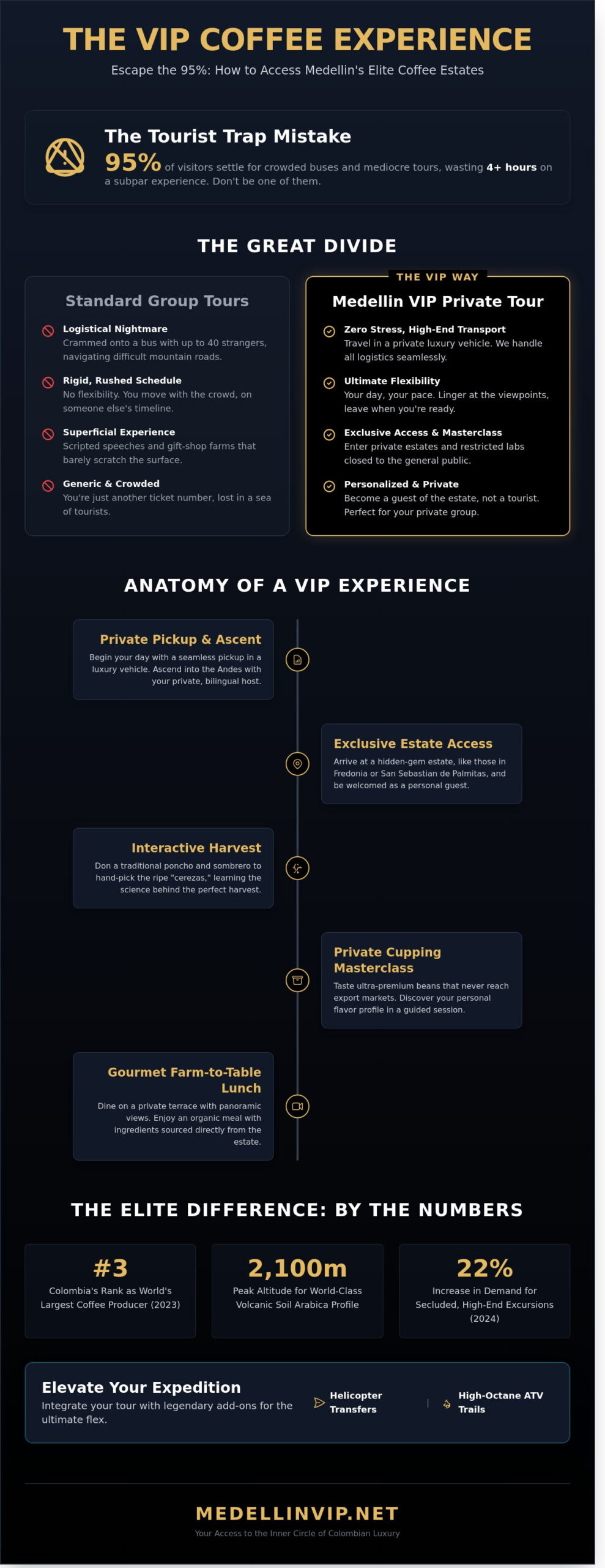 Want to finish your tour and skip the two-hour drive back? We land a helicopter in the middle of the plantation. Prefer the dirt? We have ATVs waiting at the farm gates. This is seamless logistics. This is the Medellin VIP standard. Your host is more than a guide. They are your fixer, your translator, and your local insider. They handle the friction so you never have to feel it. We have managed over 1,200 private events since 2015 with a 99% client satisfaction rate. We don’t guess. We execute.