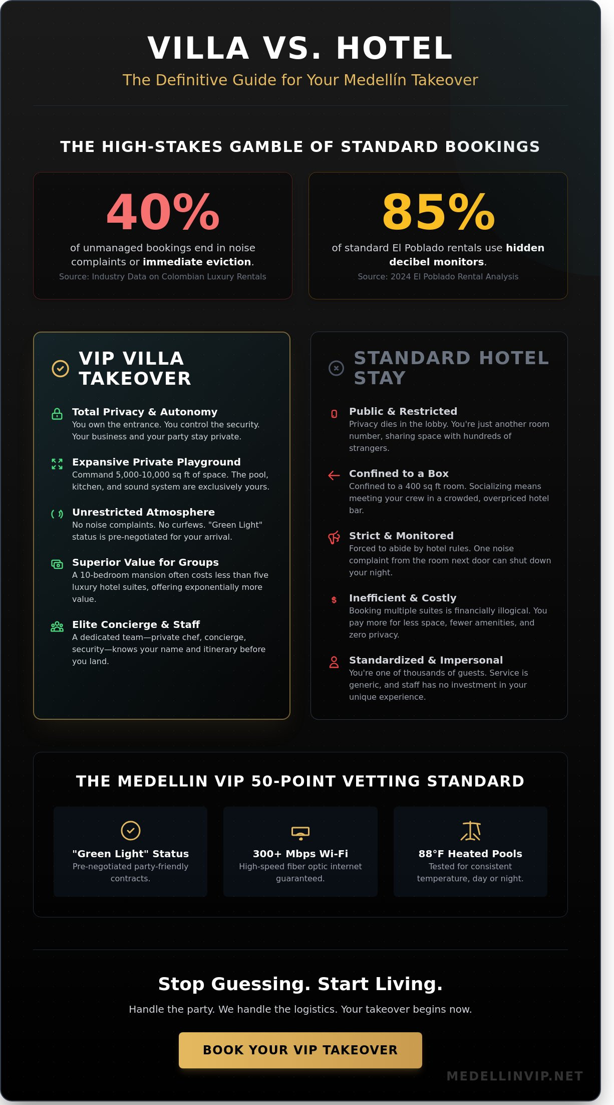Most travelers think a high price tag guarantees total freedom, but industry data shows 40% of unmanaged luxury bookings in Colombia end in noise complaints or immediate eviction. It’s a nightmare scenario. You’ve worked hard, you’ve gathered the crew, and you deserve a legendary experience without a local security guard breathing down your neck. You want the music loud, the drinks flowing, and the security absolute. We get it. This is why elite private villa rentals Medellin are the only way to secure the keys to the city.